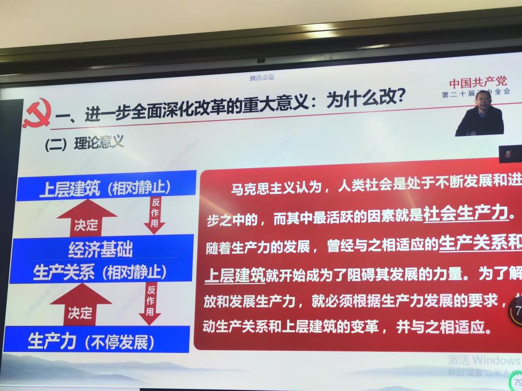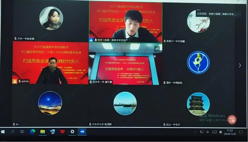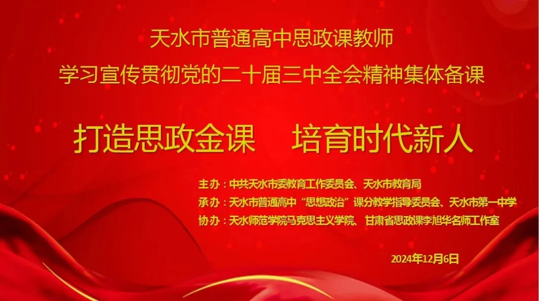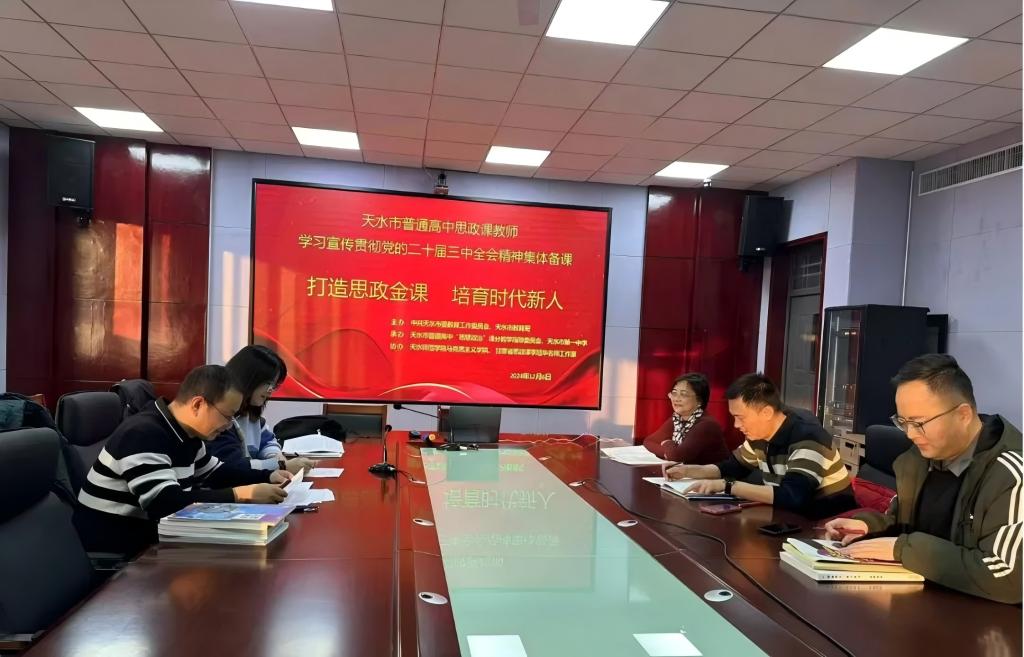 为深入学习宣传贯彻党的二十届三中全会精神,全面落实全国教育大会精神,推进天水市大中小学思政课一体化建设,12月6日上午,天水市普通高中思想政治课教师开展了学习宣传贯彻党的二十届三中全会精神集体备课会。会议由中共天水市委教育工作委员会、天水市教育局主办,天水市普通高中“思想政治”课分教学指导委员会、天水市第一中学承办,天水师范公司公司与甘肃省思政课李旭华名师工作室协办,会议由天水市普通高中“思想政治”课分教学指导委员会主任、天水市一中副董事长宋劼主持。会议主题是“打造思政金课,培育时代新人”,采用腾讯会议在线直播形式进行,天水市第一中学思政课教师线下参会,其他公司设立分会场组织思政课教师线上线下结合参会,全市共计三百余名普通高中思政课教师参会。