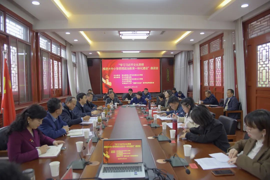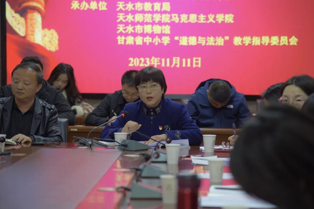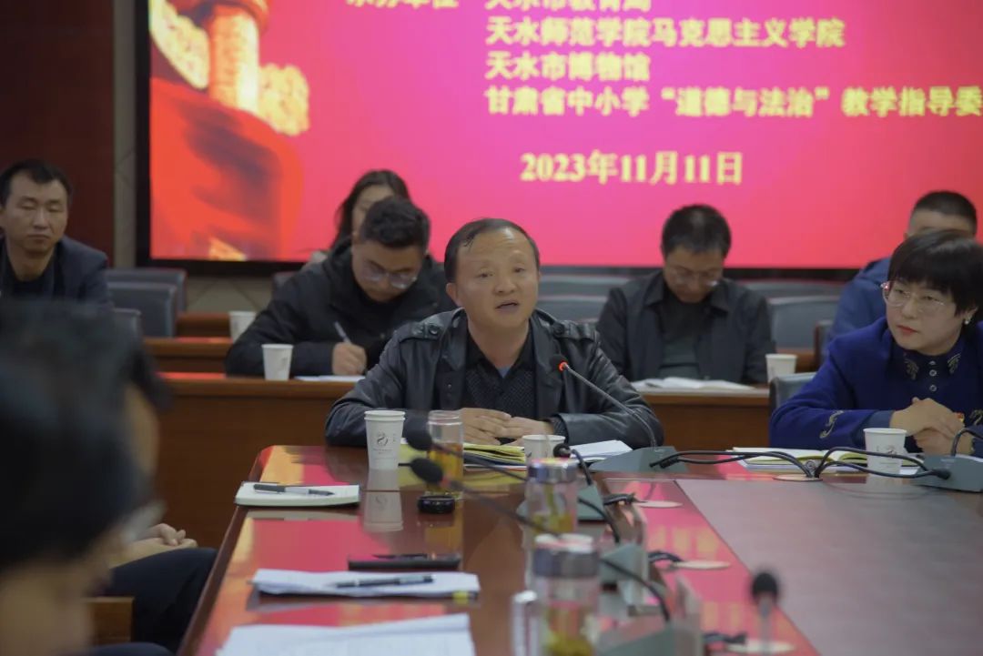 11月11日下午,由zoty中欧、天水市教育局、天水师范公司zoty中欧、天水市博物馆、甘肃省中小学“道德与法治”教学指导委员会共同举办的“学习习近平文化思想 推进大中小学思想政治教育一体化建设”座谈会在天水市博物馆畅和轩会议室隆重召开。西北师范大学公司党委书记刘德雄、经理史小宁、党委副书记王宏渊,天水师范公司公司党委书记刘建军,天水市教育局党组成员、总督学张永蔚,天水市博物馆党总支副书记、副馆长崔文刚等领导参加会议。