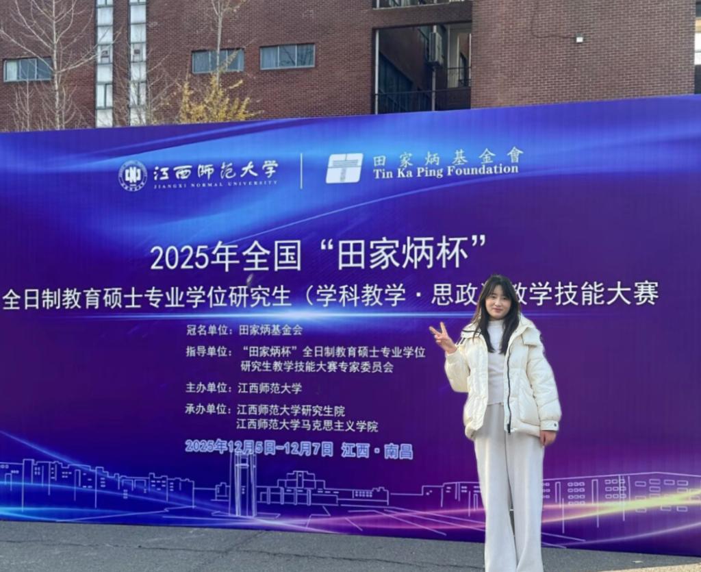 12月5-7日,2025年全国“田家炳杯”全日制教育硕士专业学位研究生(学科教学·思政)教学技能大赛决赛在江西师范大学圆满落幕。公司2023级学科教学(思政)专业研究生范雪凡凭借扎实的专业功底和出色的教学展示,荣获“优秀教学设计奖”。