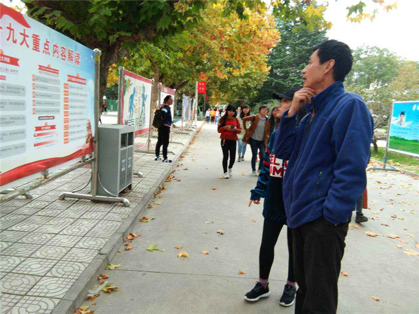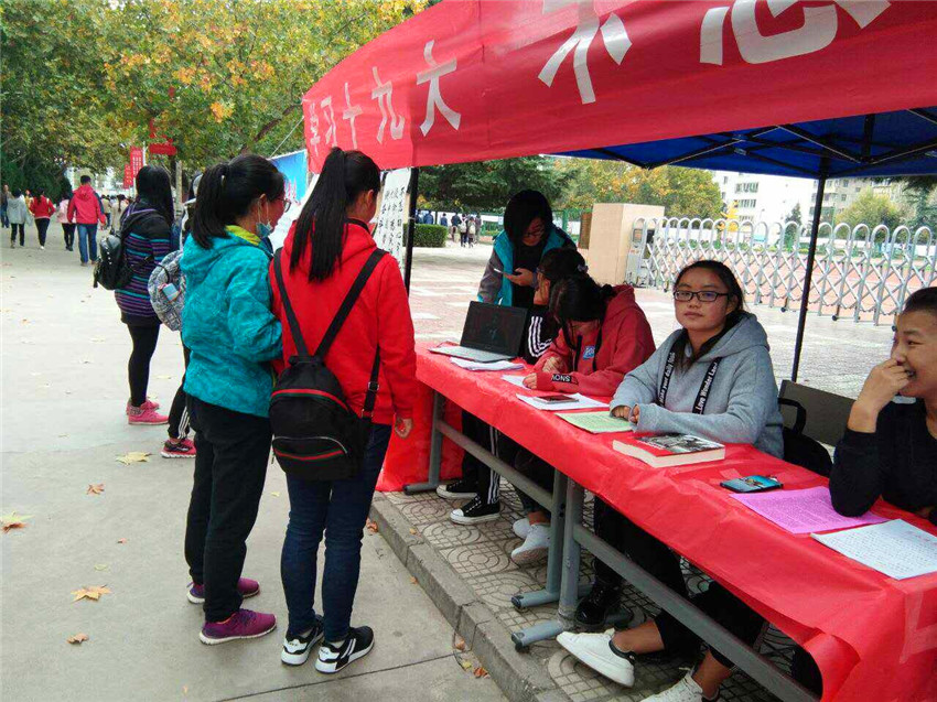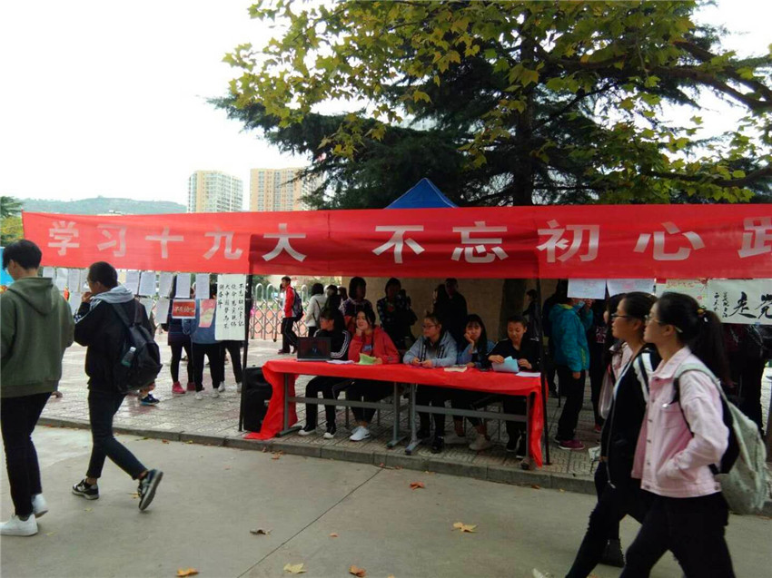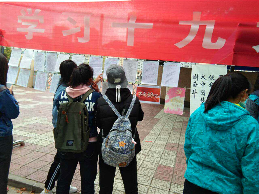 2.海报宣传和发放传单。通过海报,展板,传单,进一步解读十九大,让同学们深刻认识到,我党举什么旗、走什么路、以什么样的精神状态、担负什么样的历史使命、实现什么样的奋斗目标,并为此提出怎样行动纲领等方面的内容;