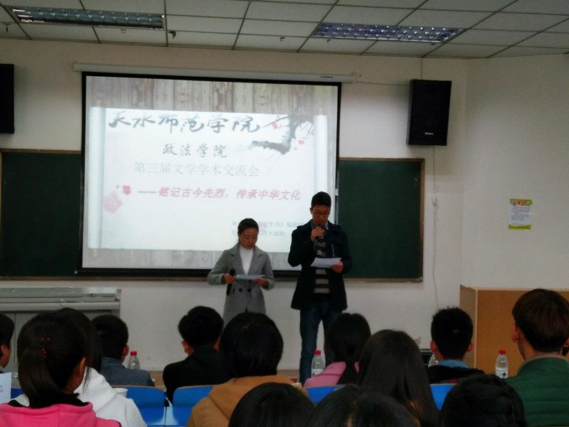 2016年11月5日上午,政法公司第三届文学学术交流会于公司7号教学楼301教室隆重举行。本次学术交流会由政法公司《求实学刊》编辑部主办,邀请甘肃机电职业技术公司公司、甘肃林业职业技术公司、甘肃省工职业技术公司相关文学学术社团与政法公司当代马克思主义研究会参会。此次活动由公司政法公司《求实学刊》编辑部主编高俊发、副主编林梦菲策划,以“铭记古今先烈,传承中华文化”为主题,通过PPT演讲、诗歌朗诵、脱稿演讲与自由讨论等多种形式展开,旨在激起当代老员工的爱国主义热情,弘扬中华民族精神,传承优秀传统文化。