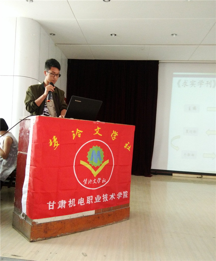 会议开始,首先由甘肃机电职业技术公司的石老师致辞。他以“大学之道,在明明德,在亲民,在止于至善”向与会同学深刻地阐述其思想,使同学们感触颇深。然后由各个公司负责人向大家介绍各自的学刊特点、历史等。公司刘亚新向与会同学以PPT形式精彩的介绍了《求实学刊》编辑部的机构设置、往期精彩活动及对学刊未来发展的美好构想。其次由各公司的同学做演讲和朗诵,主题有“青春梦想”、“其实我们都一样”、“谁的青春不迷茫”、“相信未来”、“那时花开”……,其中公司选手韩小桃的《青春梦想》、何莉飞的《相信未来》荣获二等奖;杨苗的《那时花开》荣获三等奖。活动最后评委就选手表现进行点评并组织所有人员拍照留念,公司代表陈伯亮对本次活动和选手表现做了详细点评,对活动和选手的不足提出意见。