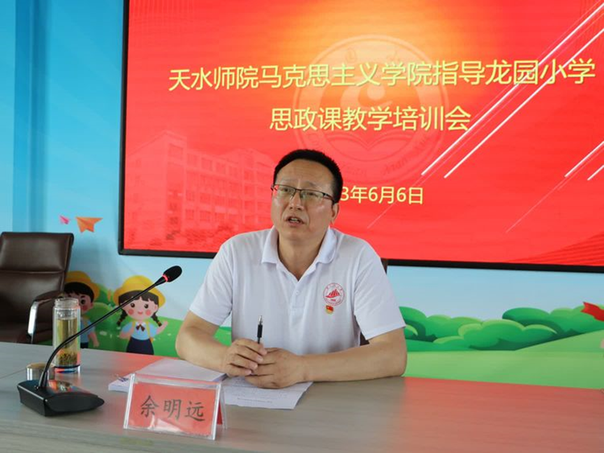 培训会由龙园小学党总支书记董君主持。他先为参会教师明确了本次培训会的目的意义,思政课是落实立德树人根本任务的一项课程,并阐述了“为谁培养人、培养什么人、怎样培养人”问题的重要课程,余经理会从理论高度、实践探究方面给我们很好的引导,希望各位老师多问多思,学有所获。