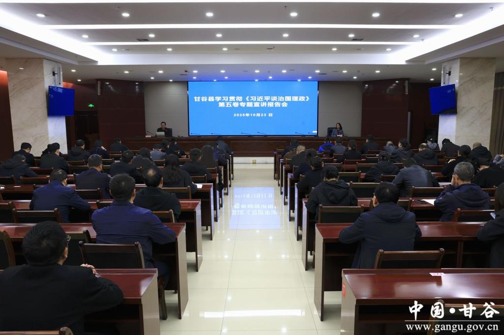 20251023日,甘谷县学习贯彻《习近平谈治国理政》第五卷专题宣讲报告会举行。邀请甘肃省思想政治理论课名师工作室主持人、市委讲师团成员余明远教授作专题辅导报告。县委常委、宣传部部长杨亚君主持报告会。